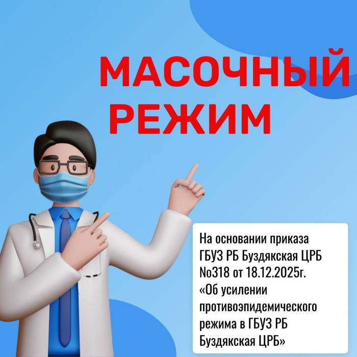 На основании приказа ГБУЗ РБ Буздякская ЦРБ №318 от 18.12.2025г. «Об усилении противоэпидемического режима», на территории ГБУЗ РБ Буздякская ЦРБ действует обязательный масочный режим.